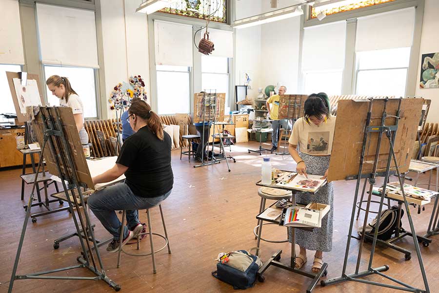 As an art major, you will take a variety of visual art classes in our 70,000-square-foot Fine Arts Building. The fully equipped facility houses graphic design and computer art studios, classrooms, a Media Realization Center, and an art education facility. You will also take art classes in our designated studios for ceramics, drawing, painting, papermaking, photography, printmaking, and sculpture. Our art studios are available to all art majors
